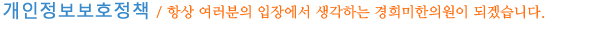 "°æÈñ¹ÌÇÑÀÇ¿ø"´Â ȸ¿ø¿©·¯ºÐÀÇ °³ÀÎÀÇ Á¤º¸¸¦ ¼ÒÁßÈ÷ »ý°¢Çϸç ȸ¿ø´ÔµéÀÇ °³ÀÎÁ¤º¸º¸È£¿¡ ÃÖ¼±À» ´ÙÇϰí ÀÖ½À´Ï´Ù. "°æÈñ¹ÌÇÑÀÇ¿ø"´Â Á¤º¸Åë½ÅºÎ¿¡¼ ÁöÁ¤ÇÑ °³ÀÎÁ¤º¸º¸È£ Áöħ Á¦ 7Á¶¿¡ ÀǰÅÇÏ¿© Á¤º¸º¸È£¸¦ À§ÇÑ Á¤Ã¥À» ÀÛ¼ºÇÏ¿© ȸ¿ø´ÔµéÀÇ ¾ÈÀüÇϰí ÀÚÀ¯·Î¿î ÀÌ¿ëÀ» º¸ÀåÇϰíÀÚ ¾Æ·¡¿Í °°ÀÌ °³ÀÎÁ¤º¸º¸È£Á¤Ã¥À» ¸í½ÃÇÕ´Ï´Ù.